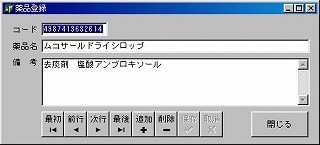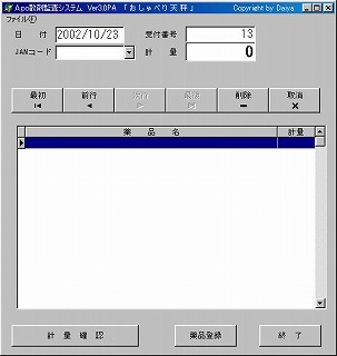 1)メイン画面(起動画面です。)・上から日付、散剤用連番は、自動入力で訂正は普通はしません。・2段目にJANコード項目と計量g数の項目があります。JANコード項目についてはセレクター(▼)で、登録済み薬品を呼び出すことも可能です。 ・計量グラム数は、電子天秤からのデータが表示されます。 ・3段目のボタン群は、過去の計量記録の閲覧・削除用のボタンです。 1週間前の計量記録を確認したければ、「前行」ボタンを1回押す毎に過去の計量記録が順次表示されます。(日付・受付番号の逆順。) 目的の計量記録が表示されたら、「計量確認」ボタンで再印刷もできます。(印刷後は自動的に新規入力画面に戻ります) 再印刷しない場合は参照終了後に必ず「最後」ボタンを押して新規入力画面に戻してください。画面を新規入力画面に戻し忘れて計量操作をしてしまうと、過去の計量記録に追加モードで記録されてしまいます。 ・4段目の大きな空欄には計量履歴が順次表示されます。 ・最下部の「計量確認」ボタンを押すと、印刷保存後、新規ページに更新されます。 ・「薬品登録」ボタンは後述。 ・「終了」ボタンは、Apo散剤監査システム及び、プロトーカーのみならず、Windowsまで一気にシャットダウンできる様になっております。このボタンの変わりにバーコード「1111111111116」を読ませるだけでも、シャットダウン可能です。 |